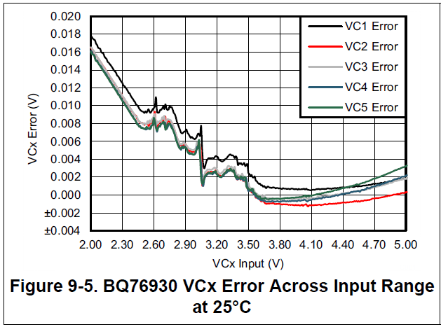 「(Google翻訳)BQ76930では電圧の歪みによりデータに不連続性が生じることがあります。セル電圧が変化すると誤差が増加し、その後、報告値が突然追いつきます。これは、データシートの8.7「標準特性」の図2にあるセルVCx誤差プロットの不連続性に表れています。」