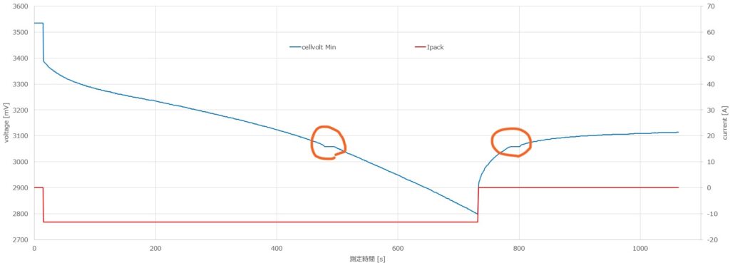 放電中は時間とともに電圧がだんだん下がっていくはずなのに、ちょっと平らになるところが出てきました。(下図、〇で囲んだところ)